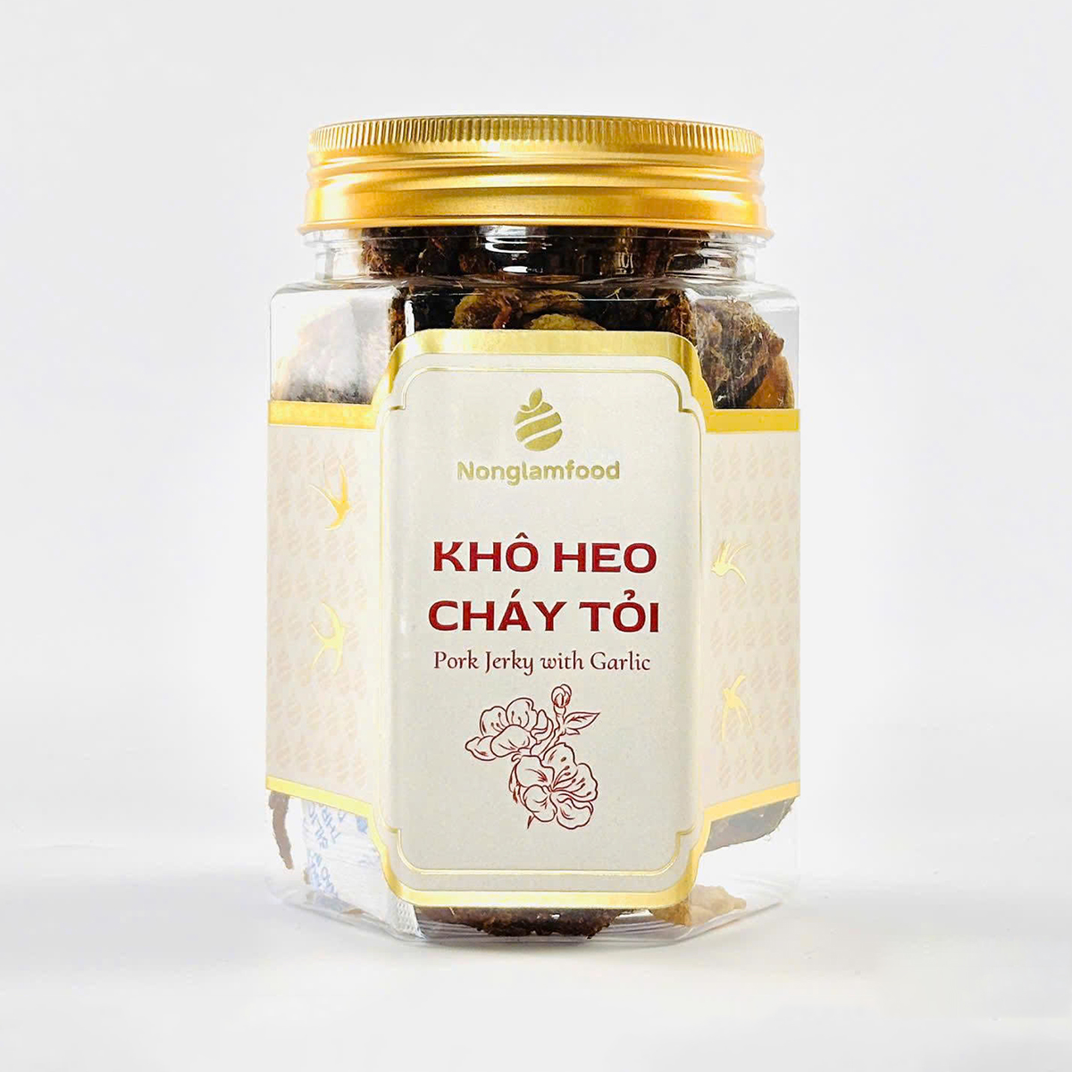KHÔ HEO CHÁY TỎI mang hương vị đậm đà với cấu trúc dai mềm tự nhiên hòa quyện cùng tỏi sấy thơm nồng. Sản phẩm vừa là món ăn vặt tiện lợi, vừa là mảnh ghép hoàn hảo để làm đầy các set quà Tết doanh nghiệp hoặc đáp ứng tiêu chuẩn cho đơn hàng gia công (OEM).